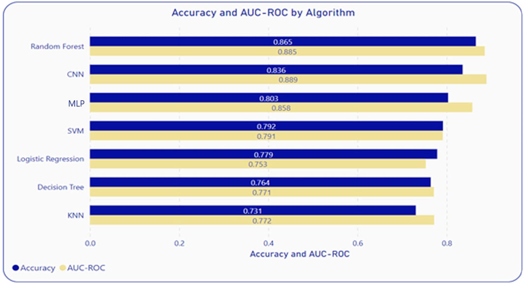 To measure performance, the following measures were used: accuracy (Acc), sensitivity (Sen), specificity (Spe), and area under the receiver-operating characteristic curve (AUC-ROC). 5-fold cross-validation was used on the entire dataset to ensure the generalization of the model and to assess model performance. Furthermore, to test the model on unseen data, testing was performed with the entire dataset using a randomized 70-30 split. This testing was repeated 10 times, and the averages were calculated to take care of data bias. Among all the algorithms included in the comparative analysis, RF and CNN demonstrated the best performance, at an accuracy and AUC-ROC of 86.5% and 88.5% respectively for RF, and 83.6%, and 88% respectively for CNN as illustrated in Figure 2. However, RF is a better algorithm due to its interpretability, computational simplicity, automatic feature importance, and simpler pre-processing of features. These metrics were within 2%–3% of the 5-fold cross-validation further proving the robustness of the RF model on unseen data.