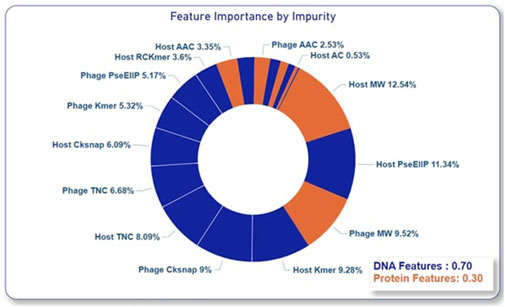 As proposed in this paper and proven by the ablation studies, composite features from both alignment-based and alignment-free methods as well as including multiple feature encodings from both nucleotides and proteins of phage and host have significantly improved the model’s performance in predicting phage-host interactions. To further gain a deeper understanding of the contribution of each alignment-free feature encoding, variable importance was assessed using the impurity method in the RF model. This estimation further proved the results of the ablation study that the nucleotide features made a greater contribution to the prediction accuracy compared to the protein features as shown in Figure 5.