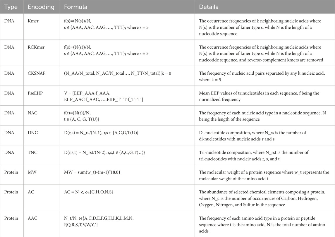 Utilizing multiple representations and a wider array of features extracted from nucleotides and proteins of both the phage and hosts enables harnessing complementary genetic signals from various levels of molecular interaction, contributing to an enhanced accuracy in phage-host prediction. To encode nucleotide sequences, feature encodings that are agnostic to the length of nucleotides were used to mitigate the influence of sequence length on bias. Following a similar approach as Li et al. (2021), feature encodings for protein sequences were generated using the iLearn tool (Chen et al., 2020). The list of these encodings can be found in Table 1.