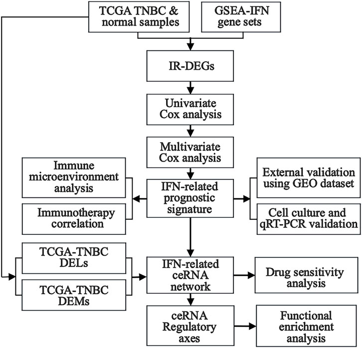 In this study, differentially expressed lncRNAs (DELs), miRNAs (DEMs), and mRNAs (DEGs) were obtained from TNBC samples in The Cancer Genome Atlas (TCGA) database, whereas interferon-related genes (IRGs) were downloaded from the Gene Set Enrichment Analysis (GSEA) website. Interferon-related differentially expressed mRNAs (IR-DEGs) were then obtained from the intersection between DEGs and IRGs. Next, Univariate Cox regression analysis was performed to identify IR-DEGs associated with survival. An interferon-related prognostic signature (IRPS) was further established by multivariate Cox regression analysis, and prognostic IR-DEGs (IR-DEGs-IRPS) were then identified. The abnormal expressions of these IR-DEGs-IRPS were also validated by using independent GEO cohorts. Afterward, the relationship between IRPS and immunotherapy was analyzed, revealing its immune infiltration landscape. Targeted pairing of the IR-DEGs-IRPS was performed through the Encyclopedia of RNA Interactomes (ENCORI) database to construct an interferon-related prognostic ceRNA network. The correlation between IR-DEGs expression from ceRNA and drug sensitivity was further explored using the CellMiner database. Finally, potentially significant regulatory axes within the ceRNA network were identified based on the targeted “lncRNA-miRNA-mRNA” interactions, and their potential effect in TNBC was assessed using GSEA. In addition, we validated the expression of IR-DEGs-IRPS in vitro (tumor versus normal cell cultures) using quantitative real-time PCR (qRT-PCR) (Figure 1). This study may offer new candidate molecular biomarkers for the poor prognosis of TNBC and contribute to a deeper understanding of the regulatory mechanisms of interferon-related ceRNA in TNBC occurrence and development.