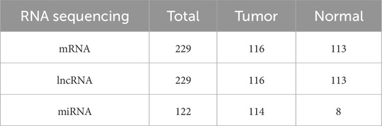RNA expression data (mRNA, lncRNA, and miRNA) associated with TNBC, along with clinical survival data, were retrieved from the TCGA database (https://portal.gdc.cancer.gov/) (Tomczak et al., 2015). Table 1 displays the sample sizes of the three kinds of RNA sequencing. A total of 464 interferon genes (Supplementary Table S1) were retrieved from the Molecular Signatures database (MSigDB) on the GSEA website (http://www.gsea-msigdb.org/gsea/index.jsp) (Subramanian et al., 2005).