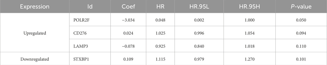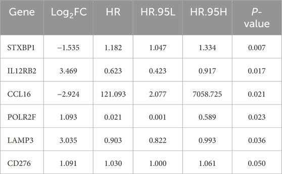 The univariate Cox regression analysis identified six survival-related IR-DEGs (STXBP1, IL12RB2, CCL16, POLR2F, LAMP3, CD276) (Table 3). An IRPS for TNBC is established through multivariate Cox regression analysis, leading to the identification of four IR-DEGs-IRPS, namely, STXBP1, LAMP3, CD276, and POLR2F (Table 4). Among these, only POLR2F serves as an independent prognostic factor for TNBC, acting as a low-risk gene with a hazard ratio (HR) value of less than 1.