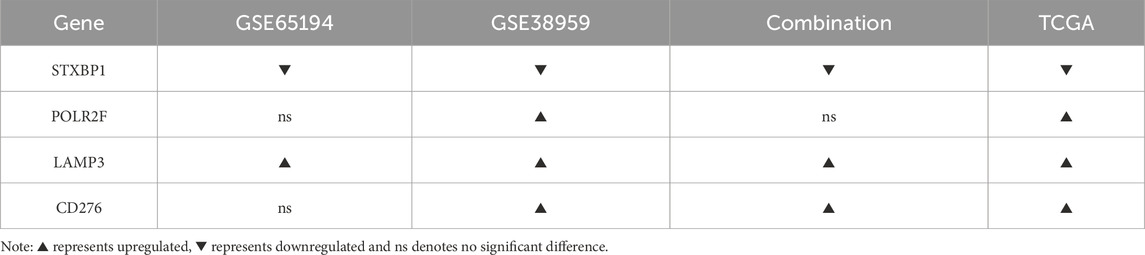 External validation using GSE65194, GSE38959, and a batch-corrected combined dataset confirmed consistent downregulation of STXBP1 and upregulation of LAMP3 across all datasets. CD276 and POLR2F followed the TCGA expression trends in GSE38959; however, neither gene reached statistical significance in GSE65194. In the combined dataset, CD276 remained consistent with TCGA trends, while POLR2F showed no significant difference. These results highlight complete cross-cohort reproducibility for STXBP1 and LAMP3, with acceptable reproducibility for POLR2F and CD276, as shown in Table 5 and Figure 4.