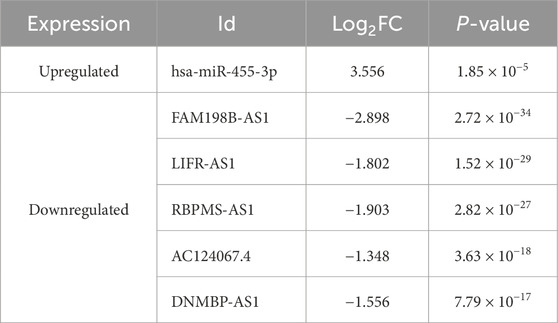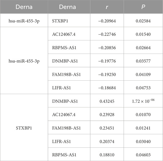 In the regulatory axis, miRNA expression is negatively correlated with both mRNA and lncRNA expressions, while lncRNA expression is positively correlated with mRNA expression, consistent with the ceRNA hypothesis. Correlation analysis reveals that only hsa-miR-455-3p-STXBP1 among the 38 DEM-IR-DEG pairs showed a significant negative correlation (P < 0.05). Additionally, 116 of 1798 DEL-DEM pairs exhibit significant negative correlations (P < 0.05). Among the indirect DEL and IR-DEG pairs, 103 pairs show significant positive correlations (P < 0.05). By using hsa-miR-455-3p as the connecting node, eight DELs (AF111167.2, AC124067.4, RBPMS-AS1, AL359220.1, DNMBP-AS1, LINC01550, FAM198B-AS1, LIFR-AS1) negatively correlated with hsa-miR-455-3p are identified, and five of them are positively correlated with STXBP1 (Table 6). After combining these five pairs of DEL-DEM with one pair of DEM-IR-DEG, five potential lncRNA/miRNA/mRNA regulatory axes are established (AC124067.4/hsa-miR-455-3p/STXBP1, RBPMS-AS1/hsa-miR-455-3p/STXBP1, DNMBP-AS1/hsa-miR-455-3p/STXBP1, FAM198B-AS1/hsa-miR-455-3p/STXBP1, LIFR-AS1/hsa-miR-455-3p/STXBP1) (Figure 9A). Table 7 presents the differential expression of miRNA and lncRNAs within ceRNA axes in TNBC by our study.
