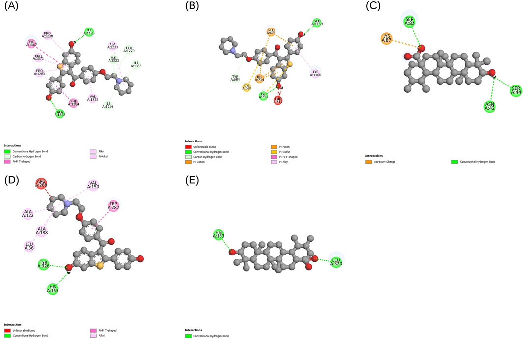 Figure 7. Docking interaction diagrams for the 4 final targets with their top-scoring ligands, visualized in Discovery Studio. Each panel shows the ligand bound in the protein’s primary pocket, defined using Prankweb: (A) NID2-Evoden; (B) THBS2-Evoden; (C) THY1-Ursolic acid; (D) VCAN-Evoden; (E) VCAN-Ursolic acid. All lead compounds achieved more binding affinities than the reference molecule 5-FU.