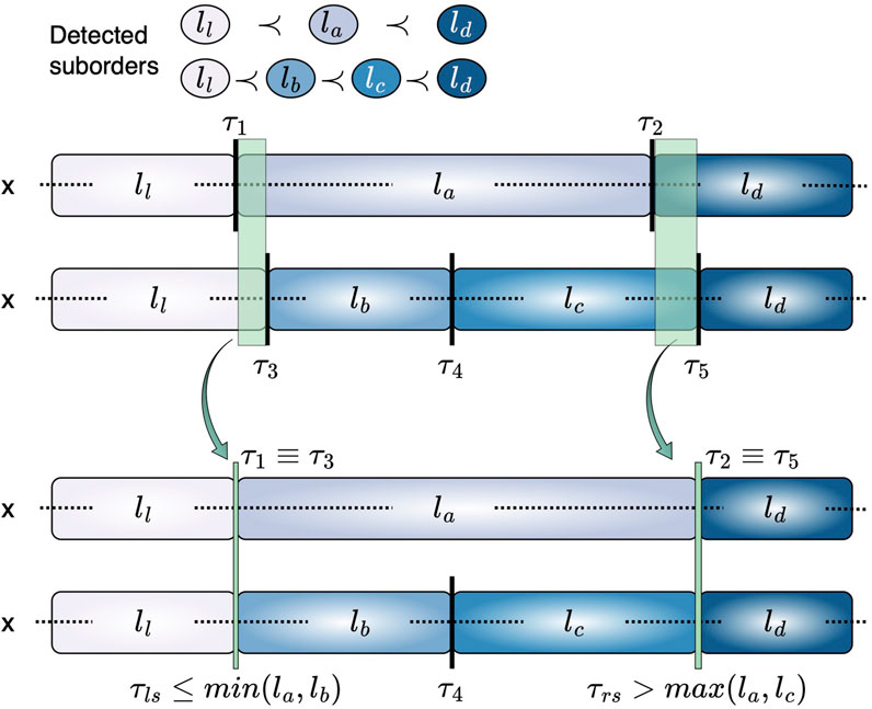 In the cascaded system, both total orders and potential suborders can be identified. When partial configurations emerge, it may be particularly valuable to investigate whether they reflect alternative advancements of the same underlying progression. In this context, the afore described properties of the thresholds can help uncover and characterize competing developmental paths. For suborders to be considered as potential parallel trajectories of the same process, they must share a subset of thresholds. In the following, we formally define the criteria that determine when a threshold qualifies as shared between suborders. Let