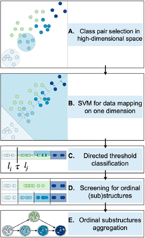 Figure 3. Depiction of the entire process for identifying ordinal structures in molecular high-throughput data. Steps A to B illustrate the data projection, beginning with the selection of a pair of classes (A) on which a binary linear classifier is utilized, followed by the projection of the data onto the boundary’s perpendicular (B). Consequently, the directed threshold classifiers are applied on the one-attribute observations (C). Ordinal patterns are found using an extensive screening procedure by means of ordinal classifier cascades (D) which are subsequently analyzed to ascertain potential alternative trajectories (E).