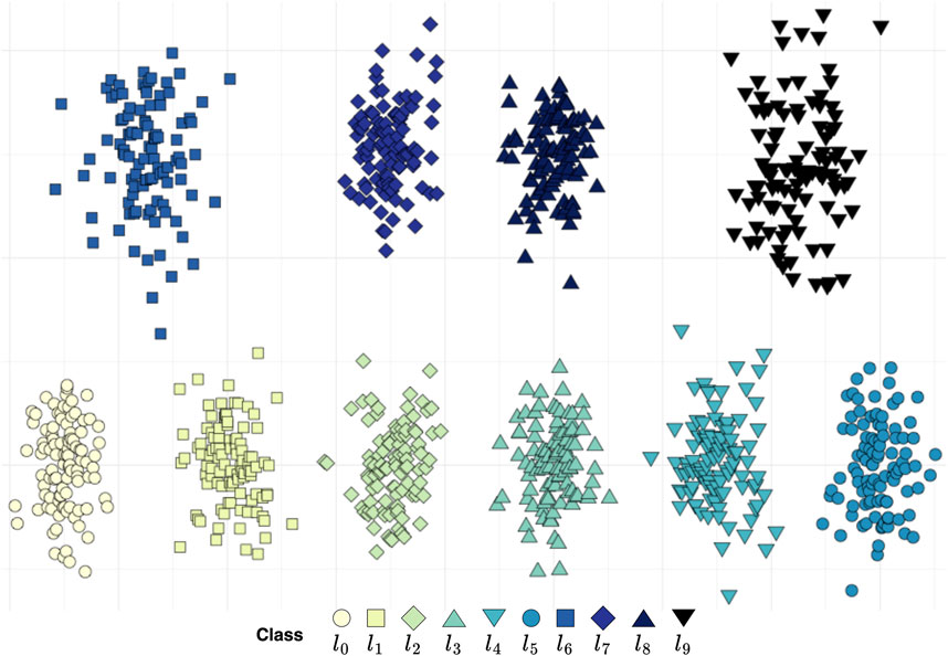 Figure 4. Synthetic two-dimensional data. Within the ten classes, no total order can be found, yet four suborders of length six are present: