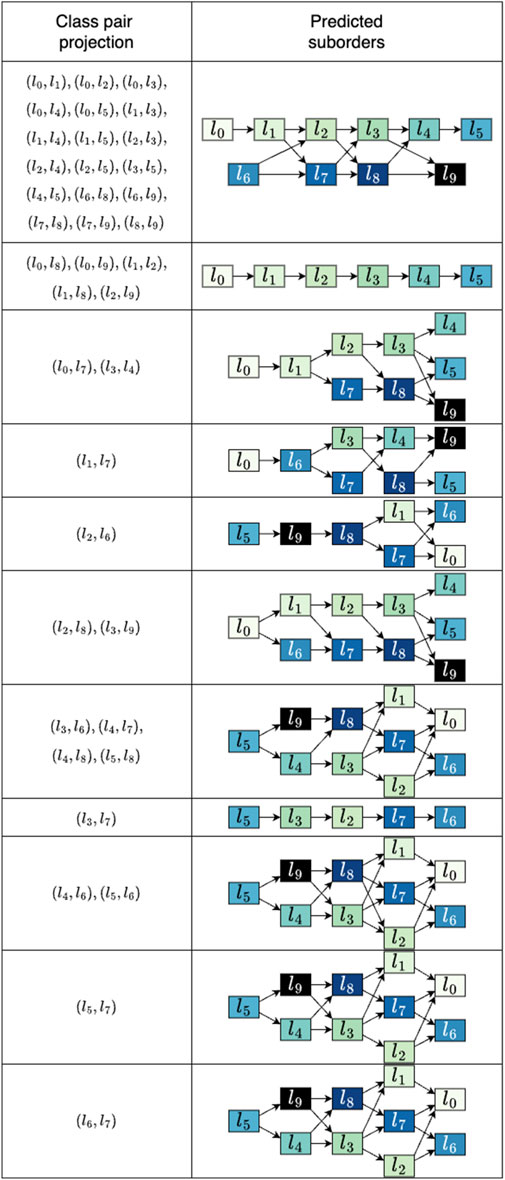 Figure 5. Predicted suborders for the synthetic data. For every outcome the corresponding pairs of classes used to project the data are listed. The resulting suborders are depicted as aggregated graphs where overlapping classes can be seen as alternatives. Only results that produced sequences of lengths six and five are shown. The average runtime for suborder screening across the 45 projections was 0.10 s.