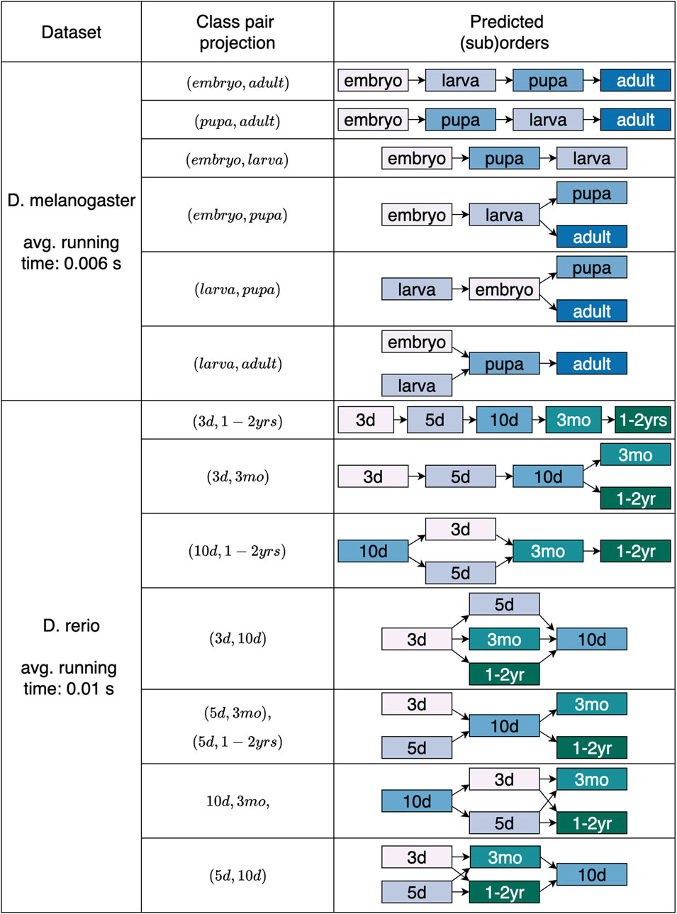 The method was validated on both, synthetic and biological datasets. When applied to the artificially generated dataset, engineered to include multiple suborders, the method accurately recovered all alternative sequences. Furthermore, we successfully rebuilt known linear stage orders in developmental data from Drosophila melanogaster and Danio rerio. These preliminary findings support the suggestion that employing projection pairs describing biologically distant stages in a specific developmental process, may more effectively direct the classifier in recognizing also intermediate phases, unlike using closely related stages that might hide certain transitions. Moreover, the results also prove that the methodology is suitable for detecting overall orders encompassing all classes, as well as suborders within data that lack an underlying total order.
