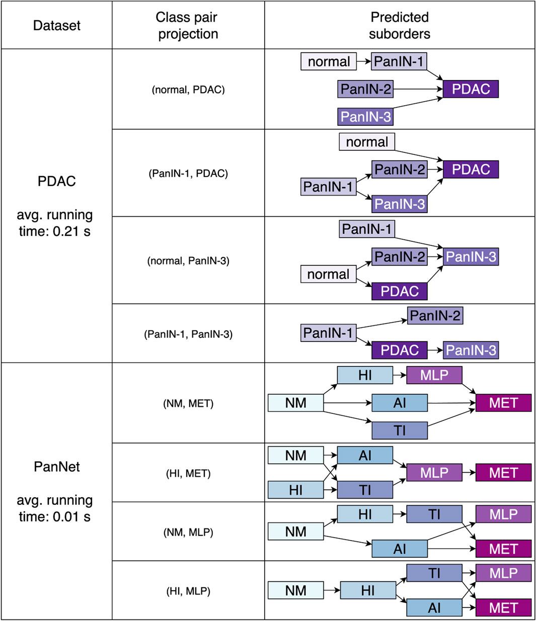 The proposed approach was further applied on the two datasets pertaining pancreatic cancer, the human PDAC and mouse PanNET. The results displayed in Figure 7 were obtained with minimal class-wise sensitivity of 1. Here, we employed projecting pairs that describe remote stages of the process under consideration. The pairs (normal, PDAC), (PanIN-1, PDAC), (normal, PanIN-3) and (PanIN-1, PanIN-3) were examined for PDAC. For PanNET we investigated (NM, MET), (HI, MET), (NM, MLP) and (HI, MLP). Each of these class combinations returned partial orders of length not greater than three for PDAC and not greater than four for PanNET.