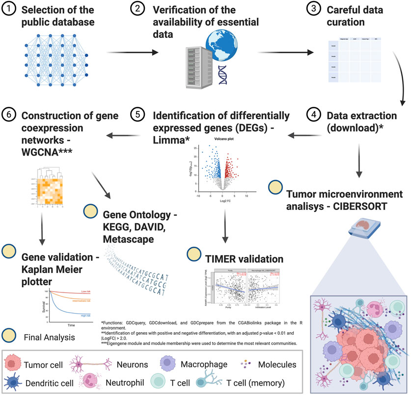Infographic illustrating a research workflow for gene expression analysis in tumor microenvironments. Steps include database selection, data verification, data curation, extraction, and analysis methods like WGCNA and CIBERSORT. Involves tools such as Limma, KEGG, and TIMER, with final steps including gene validation and Kaplan-Meier plots. Color-coded icons represent various cell types like tumor cells, neurons, and macrophages.