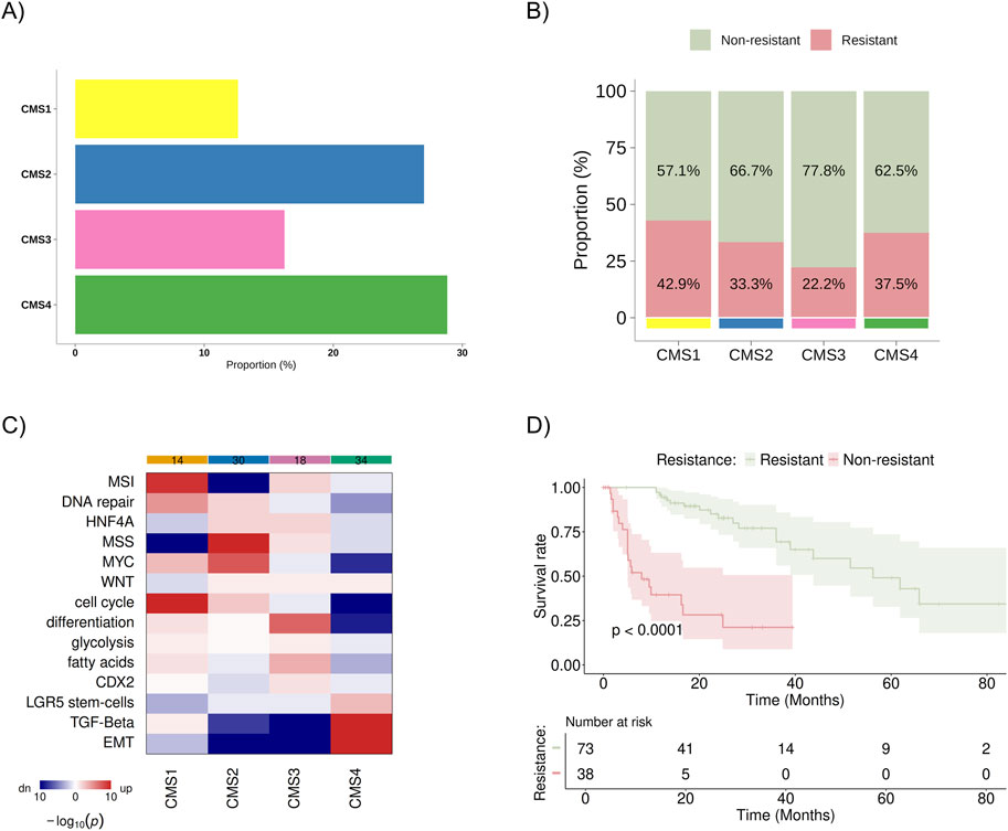 Figure 2. Distribution and characteristics of the study population sample. (A) Baseline distribution of consensus molecular subtypes (CMS1–CMS4) in the cohort (B) Proportion of patients classified as resistant (progression within 9 months of treatment) and non-resistant (progression after 9 months of treatment) within each CMS group, with values normalized to 100% across all subtypes. (C) Heatmap showing the results of gene set analysis based on mRNA sequencing, confirming the known characteristics of each CMS group. Color spectrum: red indicates upregulation, and blue indicates downregulation. (D) KM survival curve for overall survival between resistant and non-resistant groups. MSI, microsatellite instability; HNF4A, hepatocyte nuclear factor 4 alpha; MSS, microsatellite stability; MYC, pathway related to the c-Myc proto-oncogene; WNT, pathway related to the WNT protein-coding gene; CDX2, caudal-type homeobox 2; LGR5, leucine-rich repeat-containing G-protein coupled receptor 5; TGF-β, transforming growth factor beta; EMT, epithelial-mesenchymal transition.