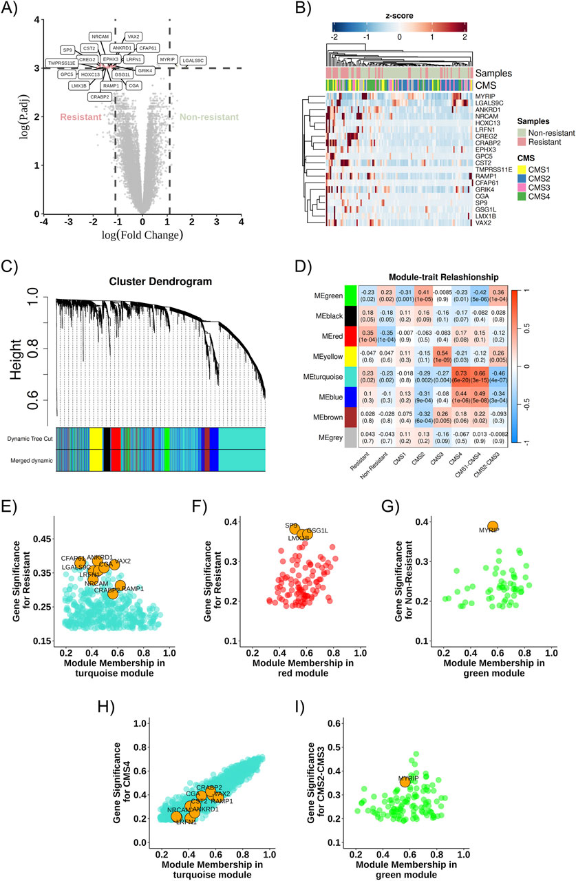 Figure 3. Co-expression network and DEGs. (A) Volcano plot highlighting the identified DEGs, comparing Resistant (left) and Non-Resistant (right) groups, logFC >2 and pValue <0.05. (B) Heatmap showing the identified DEGs and their relationship across groups (Non-Resistant, Resistant, and CMS1, CMS2, CMS3, CMS4); positively regulated genes are shown in red, and negatively regulated genes in blue. (C) Dendrogram of gene distribution in co-expression modules. (D) Heatmap representing the correlation strength between gene co-expression modules and the analysis categories. (E) Turquoise module about the resistance phenotype. (F) Red module about the resistance phenotype. (G) Green module about the non-resistant phenotype. (H) Turquoise module about the CMS4 phenotype. (I) Green module about the CMS2-CMS3 phenotype. The DEGs found in each community are highlighted in orange as potential cellular markers. DEG, differentially expressed gene; ME, Module eigengenes.