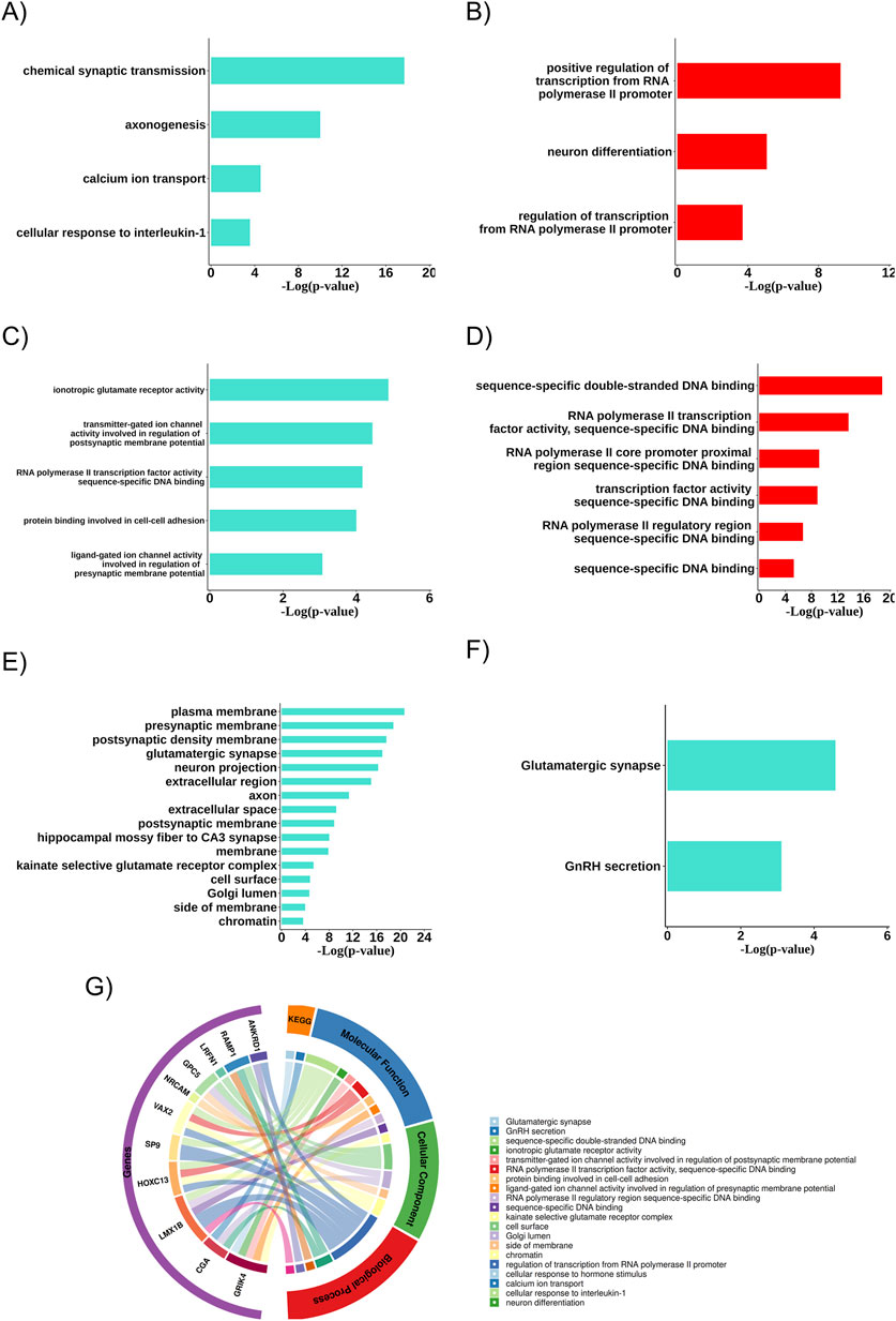 Seven panels depict bar charts analyzing gene expression data. Panels A-F show various biological processes with bars representing significant terms: A) chemical synaptic transmission, axonogenesis; B) positive regulation of transcription; C) ionotropic glutamate receptor activity; D) sequence-specific DNA binding; E) cellular components like plasma membrane; F) glutamatergic synapse significance. Panel G is a circular diagram categorizing gene functions into KEGG, Molecular Function, Biological Process, and Cellular Component, with colored connections illustrating relationships.