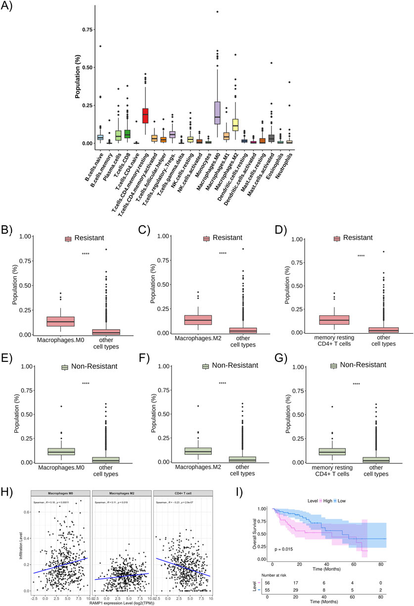 Figure 5. Proportion of immune cells in the studied population (A) Proportion and distribution of immune cell subtypes in the total studied population. (B) The proportion of M0 macrophages in the resistant patient group (red bars). (C) The proportion of M2 macrophages in the resistant patient group (red bars). (D) The proportion of resting memory CD4+ T cells in the resistant patient group (red bars). (E) The proportion of M0 macrophages in the non-resistant patient group (green bars). (F) The proportion of M2 macrophages in the non-resistant patient group (green bars). (G) The proportion of resting memory CD4+ T cells in the non-resistant patient group (green bars). (H) Relationship between the infiltration levels of M0 macrophages, M2 macrophages, and CD4+ T cells and the expression level of RAMP1 (a resistance-related differentially expressed gene), considering the entire TCGA dataset for colon adenocarcinoma (and not only metastatic samples), with statistical correlation calculated using the Spearman method. (I) Kaplan-Meier curve of overall survival about the expression level of RAMP1 (resistance-related differentially expressed gene). ***: p < 0.0001.