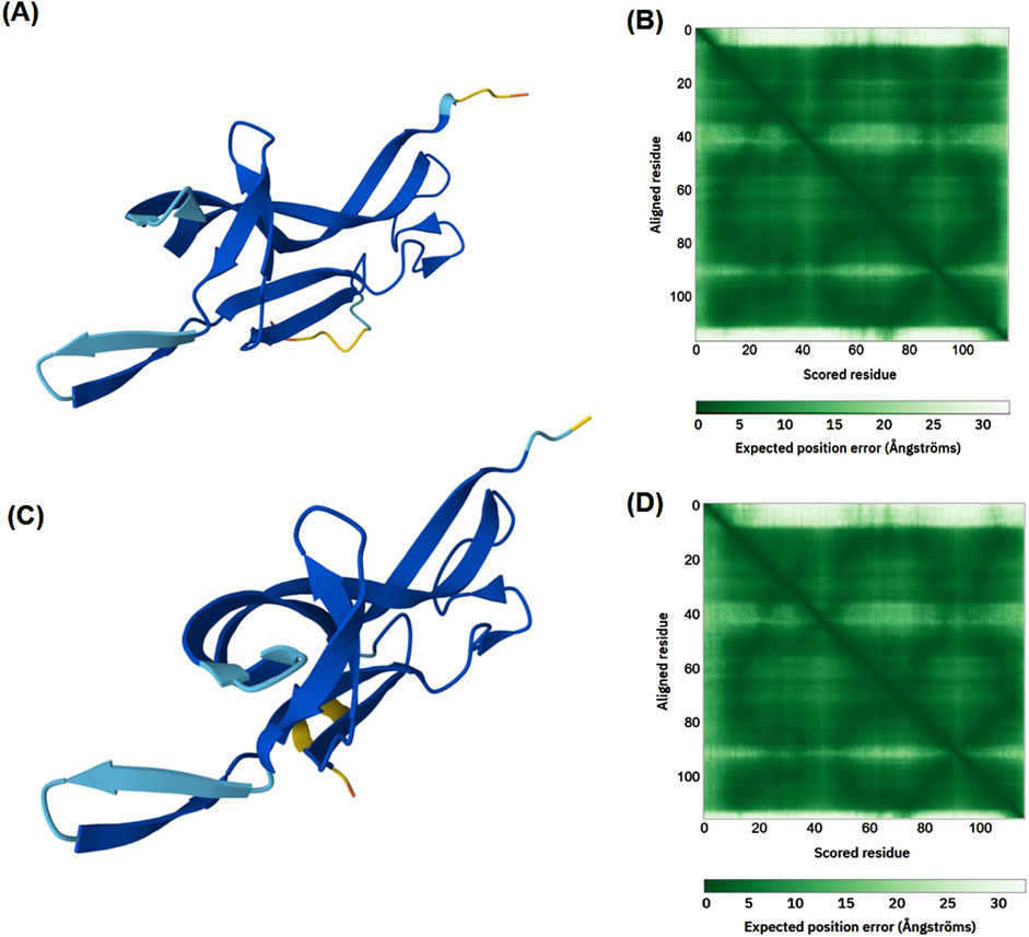 Figure 2. Structures of (A) drNGF and (C) nnNGF predicted by AlphaFold2; the confidence levels are indicated in blue (high confidence, pLDDT > 90) and cyan (moderate confidence, 70 < pLDDT < 90). Predicted aligned error scores of (B) drNGF and (D) nnNGF shown as colour variations, where the green regions signify well-modelled structures with high confidence and minimal errors.