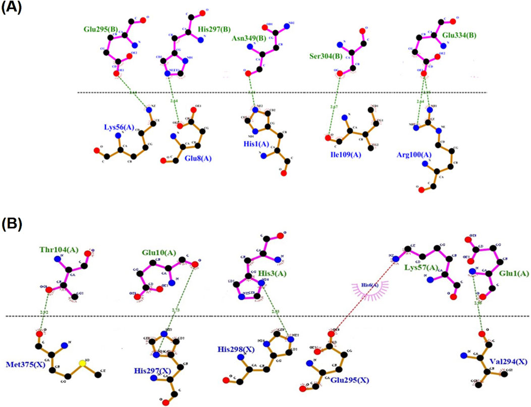 Figure 4. Two-dimensional representations of the docked complexes of (A) drNGF-TrkA and (B) nnNGF-TrkA visualised using Dimplot of Ligplot; the docked complexes were obtained from HADDOCK. The hydrogen bonds are shown in green while the red dotted lines indicate salt bridges.