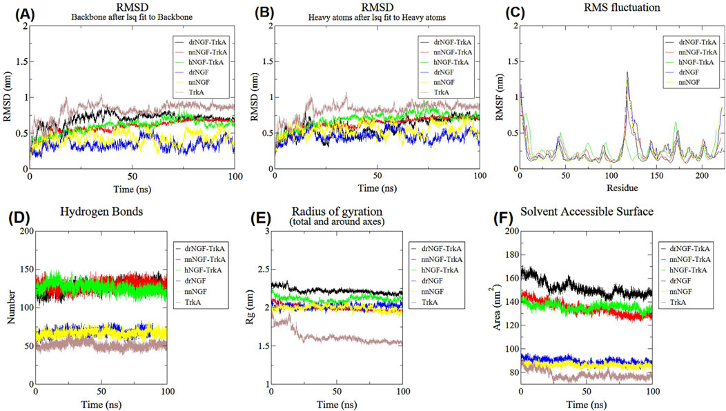 Figure 5. Molecular dynamics simulation results of drNGF-TrkA, nnNGF-TrkA, hNGF-TrkA, drNGF, nnNGF, hNGF, and TrkA. (A) Graph showing the root mean-squared distance (RMSD) values of the backbone structures of all the complexes; (B) RMSD of the side chains; (C) root mean-squared fluctuation (RMSF) values; (D) numbers of hydrogen bonds in the different complexes; (E) radius of gyration; (F) solvent accessible surfaces of the complexes.