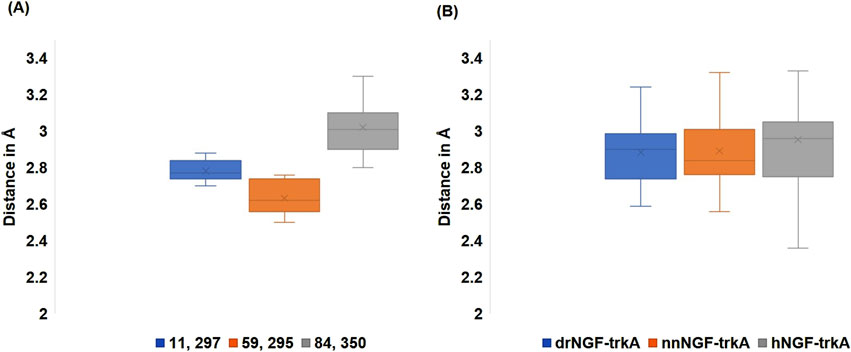 Figure 6. (A) Lengths of the hydrogen bonds formed between the active site residues that were maintained throughout the simulation period. The active site residues (E11, H297), (R59, E295), and (H84, Q350) are shown in blue, orange, and grey colours, respectively. (B) Lengths of the hydrogen bonds formed between all the interacting site residues over the entire simulation period of 100 ns; drNGF-TrkA, nnNGF-TrkA, and hNGF-TrkA are represented in blue, orange, and grey colours, respectively.