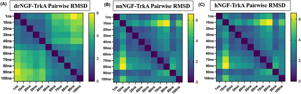 Figure 8. Pairwise RMSD values of the three complexes, where drNGF-TrkA shows the highest variation initially but gradually reduces and stabilises over time. Overall, the average pairwise RMSD values are similar for (A) drNGF-TrkA; (B) nnNGF-TrkA; (C) hNGF-TrkA, indicating that they are conserved. Low RMSD values indicate similar conformational states, while higher RMSD values indicate a range of conformational states. The RMSD values are low towards the higher end of the time scale of the molecular dynamics simulations, indicating stable structures of the NGF-TrkA complexes.