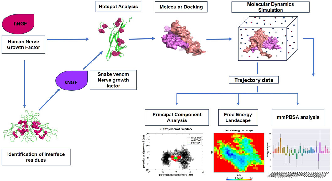 Introduction: Neurodegenerative diseases pose significant challenges owing to the limited number of effective therapies. Nerve growth factor (NGF) plays a crucial role in neuronal survival and differentiation through tropomyosin receptor kinase A (TrkA). Although snake venom NGF (sNGF) has been studied for its ability to activate TrkA, the binding modes and associated dynamics remain unclear compared to those of human NGF (hNGF). Herein, we explored the possibilities of NGFs from Daboia russelii and Naja naja as potential therapeutic alternatives to hNGF by comparing the structural similarities and conserved binding residues.
