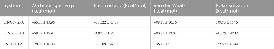 Post-simulation mmPBSA analysis showed that the drNGF-TrkA and nnNGF-TrkA complexes achieved more favourable binding energies than hNGF-TrkA. The results of the mmPBSA analysis suggest that drNGF-TrkA and nnNGF-TrkA have higher binding energies, meaning that drNGF and nnNGF have more affinity towards TrkA than hNGF, as presented in Table 5. The strong binding energies predicted for the sNGFs could imply higher potency and efficacy of the protein function with improved selectivity as well as ability to stay bound to the receptor for a longer period of time; this high binding affinity may be attributed to the differences in the decomposition of each of the residues in the protein toward the protein interactions. The major energy components contributing to the binding energies of the molecules are van der Waals energy, electrostatic interactions, and polar solvation energy for drNGF-TrkA; van der Waals energy, electrostatic interactions from the Poisson–Boltzmann calculations, and polar solvation energy for nnNGF-TrkA; as well as van der Waals energy and electrostatic interactions for hNGF-TrkA. Altogether, the van der Waals and electrostatic interactions play pivotal roles and contribute significantly to the binding energies of all three complexes.