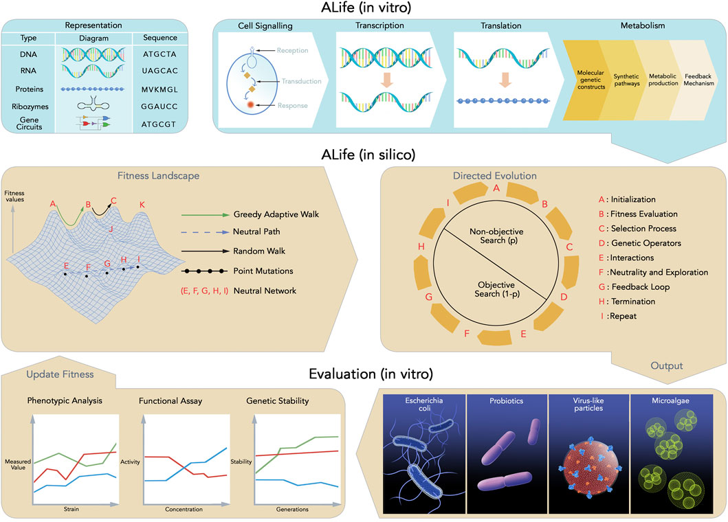 There are two key problems that confound the synthesis and deployment of ALife for real-world applications. First, current bioengineering platforms (Grozinger et al., 2019) are mainly intentionally limited to function within controlled laboratory (in vitro) environments, serving as a critical bio-safety measure to prevent unintended environmental release or ecological impact (Gao et al., 2025). However, in some instances, this limitation is unintentional rather than caused by technical constraints, specifically the inability to accurately translate in vitro functioning systems into robust, self-sustaining entities capable of reliable performance in complex, real-world settings (Hitchins, 2008). This persistent gap between laboratory success and operational viability outside the laboratory remains a significant barrier to the development of deployable artificial life systems (Brooks and Alper, 2021). Second, there is no gold-standard method to direct the evolutionary design of organisms for optimal adaptation to a given task environment (application) (Wang et al., 2021) because designing a globally optimal organism requires balancing trade-offs between multiple, often competing, objectives, such as efficiency, robustness, and adaptability, rather than optimizing a single property (Vincent, 2017). Consequently, the synthesis of problem-solving ALife depends on predicting evolutionary trajectories, which in turn requires sufficient knowledge of the organism’s underlying fitness landscape (Wortel et al., 2023). A fitness landscape is a conceptual framework that can be visualized as a multidimensional surface, where each genotype occupies a position in sequence space and its corresponding fitness value determines the height at that point (Poelwijk et al., 2007). At the molecular level, the sequence space is the combinatorial space of all possible nucleotide or amino acid sequences (Povolotskaya and Kondrashov, 2010). In this review, we specifically refer to proteins and nucleic acids, where the notion of sequence space is well defined. Fitness is a flexible and context-dependent measure of performance according to a specific function or goal, such as catalytic activity in ribozymes (Schoenle et al., 2018) and the fitness function is the specific rule or calculation used to assign a quantitative score that measures the goodness of any possible solution for a given problem (Wang et al., 2021). Fitness landscapes have been demonstrated as critical to optimization in various applications, beyond synthetic biology (Yi and Dean, 2019), including ecology (Sanchez-Gorostiaga et al., 2019) and biomedicine (Nichol et al., 2015). Mapping fitness landscapes has been demonstrated as notoriously difficult (Poelwijk et al., 2007), such that predicting and controlling the evolutionary trajectories of bioengineered agents remains one of the significant obstacle to synthetic (biological) ALife reaching its full potential (Lässig et al., 2017). Although understanding fitness landscapes is not the sole limitation in constructing synthetic life, it illustrates significant methodological and conceptual challenges (Brun-Usan et al., 2022). These challenges restrict the integration of molecular, cellular, and system-level processes into unified, evolving artificial systems (Rothschild et al., 2024). This article thus focuses on the methodological deficiencies in mapping fitness landscapes and directed evolution as core mechanisms driving the evolutionary design of synthetic ALife. Artificial evolutionary design, inspired by natural evolution as the core proponent of biological design, diversity and adaptivity, has been a constant source of novel and innovative solutions to a vast array of design and optimization problems (Eiben and Smith, 2015a).