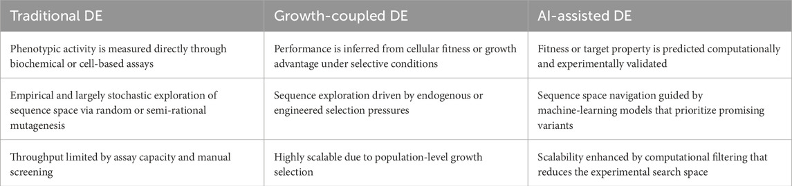 Directed evolution modalities can be classified into three categories: traditional directed evolution (Cheng et al., 2015), growth-coupled directed evolution (Chen et al., 2022), and AI-assisted directed evolution (Yang et al., 2025). Traditional and growth-coupled approaches rely primarily on experimental diversification and selection, whereas AI-assisted directed evolution augments or partially replaces empirical screening with model-guided design. Complementary strengths between these frameworks exist as traditional and growth-coupled methods offer robust, biology-native selection regimes but can be experimentally intensive, while AI-assisted DE can accelerate convergence and explore sequence space more efficiently, at the cost of increased dependence on data quality and modeling assumptions. Table 1 presents a comparison of the three modalities.