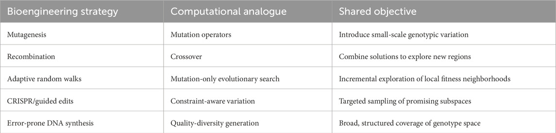 Mutation serves as a fundamental source of genetic diversity, and facilitates the enhancement of a population’s evolvability and fitness (Wagner, 2023). Genetic stability in engineered cell populations remains a significant challenge in synthetic biology, as synthetic constructs impose burdens on host cells and promote mutations that can eliminate engineered functions (Sechkar and Steel, 2025). Previous mutation-control strategies have typically relied on gene-specific designs, which limit their general applicability (Sechkar and Steel, 2025). Sechkar and Steel (Sechkar and Steel, 2025) proposed a universal biomolecular controller that suppresses mutant growth regardless of circuit identity, demonstrating enhanced performance and adaptability through resource-aware modeling and simulation. A prevalent example is of mutations in the SARS-CoV-2 genotype leading to changes in the protein structure (genetic diversity) resulting in an increase in the infectiousness, fitness, and virulence of the SARSCoV-2 virus (DeGrace et al., 2022). In bioengineering, approaches for generating genetic diversity include adaptive random walks (Rotrattanadumrong and Yokobayashi, 2024) of the conceptual representation that maps genotypes to their corresponding fitness values (fitness landscape), reshuffling of hereditary information by exchanging segments between related sequences, creating new combinations (recombination) either through DNA shuffling (Stemmer, 1994), and unpredictable changes throughout a genetic sequence to create a wide variety of variants (random mutagenesis). The latter is done in vitro using specially designed alterations in synthetically derived DNA (Morrison et al., 2020), or in vivo via genotype engineering tools such as CRISPR (Naseri and Koffas, 2020). Such genetic diversity generation methods enable the sampling and testing of a broader range of genetically diverse sequences, which is tantamount to evolutionary computation diversity maintenance methods such as quality-diversity (Pugh et al., 2016), where both approaches are designed to improve fitness landscape exploration and thus solution quality in directed evolution (Wang et al., 2021).