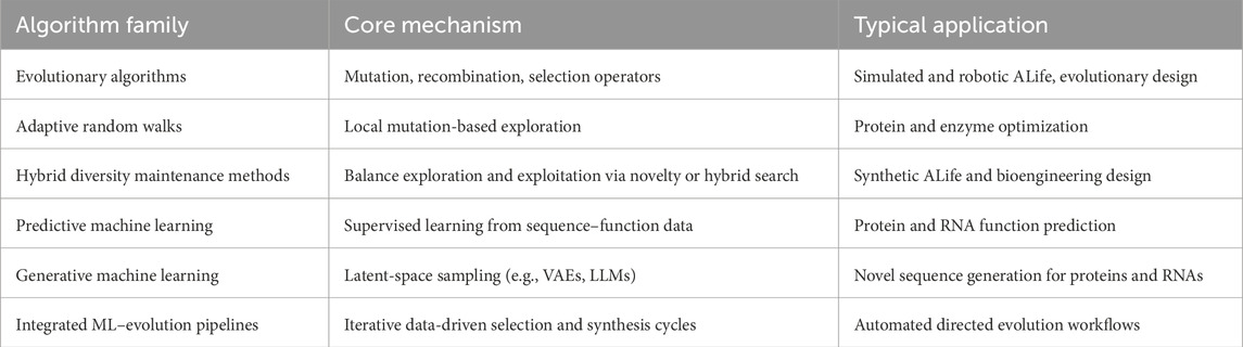 Directed evolution (DE) is a closed loop evolutionary optimization that mimics the process of natural evolution, but on a shorter timescale, where a the specific rule or calculation used to assign a quantitative score that measures the goodness of any possible solution for a given problem) objectifies (fitness function) a specific target, and thus individuals are selected for improvement based on measured performance according to a specific function or goal, such as catalytic activity, binding affinity, growth rate and substrate specificity (fitness) (Knowles, 2010). Recent advances in machine learning have been applied to optimise directed evolution, leading to greater efficiency and predictive accuracy (James et al., 2024). However, most existing methodologies rely on DNA sequencing and synthesis, rendering them resource-intensive and less compatible with emerging in vivo mutagenesis techniques (James et al., 2024). In response to these limitations, James et al. (2024) explored the GB1 and TrpB empirical landscapes without sequencing information and demonstrated up to 19-fold and 7-fold increases, respectively, in the probability of reaching the global fitness peak. In the evolutionary design of ALife, directed evolution has produced a diverse range of simulated and robotic organisms, demonstrating the artificial evolution of various forms of “life as it could be” (Aguilar et al., 2014). In bioengineering, directed evolution enables the rapid selection of tiny building blocks of life (biomolecules) with properties suitable for applications such as protein engineering (Packer and Liu, 2015), isolating new enzyme variants with improved function (Currin et al., 2021), generating novel bio-catalysts (Coelho et al., 2013), and engineering genetic parts and synthetic gene circuits (Wang et al., 2021) as the biological components of various bioengineering applications (Cubillos-Ruiz et al., 2021). Directed evolution is becoming increasingly important as an experimental tool to bioengineer holistic genetic constructs containing multiple biological components (Vidal et al., 2023) (synthetic ALife). Since the first in vitro evolution experiments (Mills and Spiegelman, 1967), many techniques have been developed to address the two key steps of directed evolution: genetic diversification (library generation), and isolating genetic variants of interest (Vidal et al., 2023).