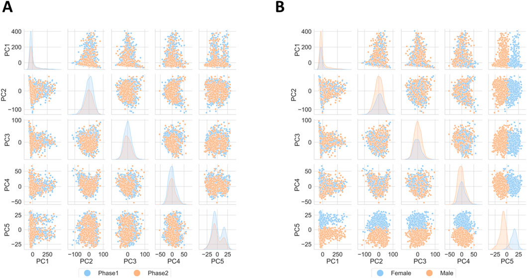 The central subject of the exploratory data analysis was to ensure that the dataset does not include significant technical noise. This step was of particular importance, since the study conducted by the PPMI includes samples gathered from the same individuals (from both, control and case cohorts) over several visits over the course of 8 months, with each visit occurring 2 months from the previous one. Also, sequencing took place in two phases. Depictions of the percentual distribution of visits and age groups of individuals the samples of which were sequenced at distinct phases are presented within the image panel S1. Supplementary Figure S1 presents the distribution of age groups within each sequencing phase. Supplementary Figure S2 shows the distribution of samples grouped by visit across the sequencing phases where it is made apparent, that all samples taken on the second visit were sequenced during the second phase. The notion of separate sequencing phases as well as having samples from visits at different points in time, could potentially introduce artificial bias in the resulting expression values. Based on these variables Principal Component Analysis (PCA) was conducted as a measure to visualize the variance behavior and whether clusters based on the identified technical factors form. Figure 1A shows PCA results by gender, with PC5 (under 2% variance) indicating distinct clusters. Figure 1B shows the PCA results by sequencing phase, where no separate clusters form, thus the variance introduced by the sequencing phase may be deemed practically non-existent.