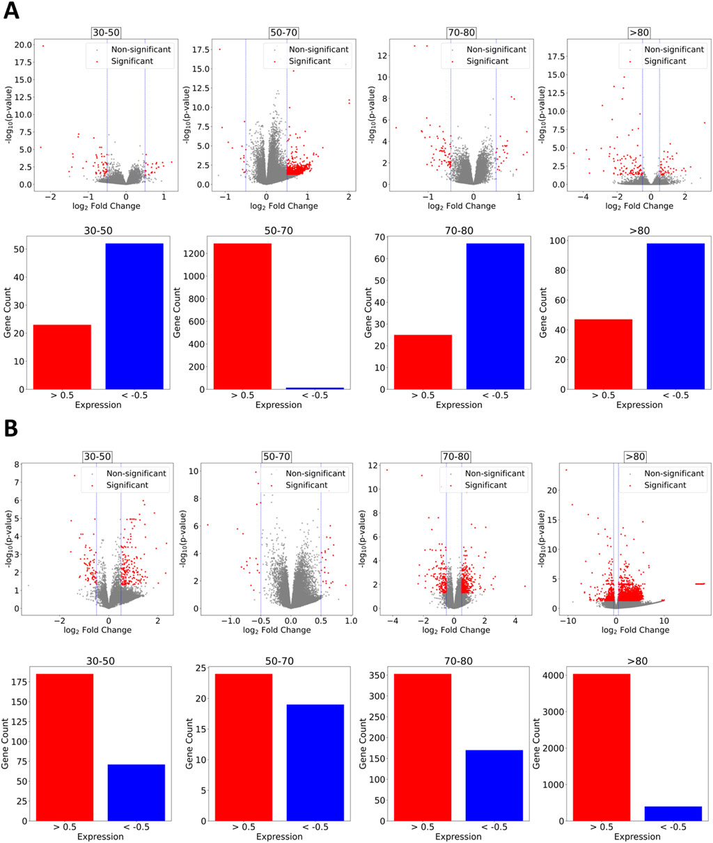 Figure 2. Differential Gene Expression. (A) Males. Overall trend across age groups towards downregulation with the exception of the age 50–70 group, which exhibits an extensive number of upregulated genes and relatively few downregulated ones. (B) Females. Expression motifs tend to upregulation. Significantly less downregulated genes compared to upregulated are observed for age groups 30–50 and over 80 years of age.