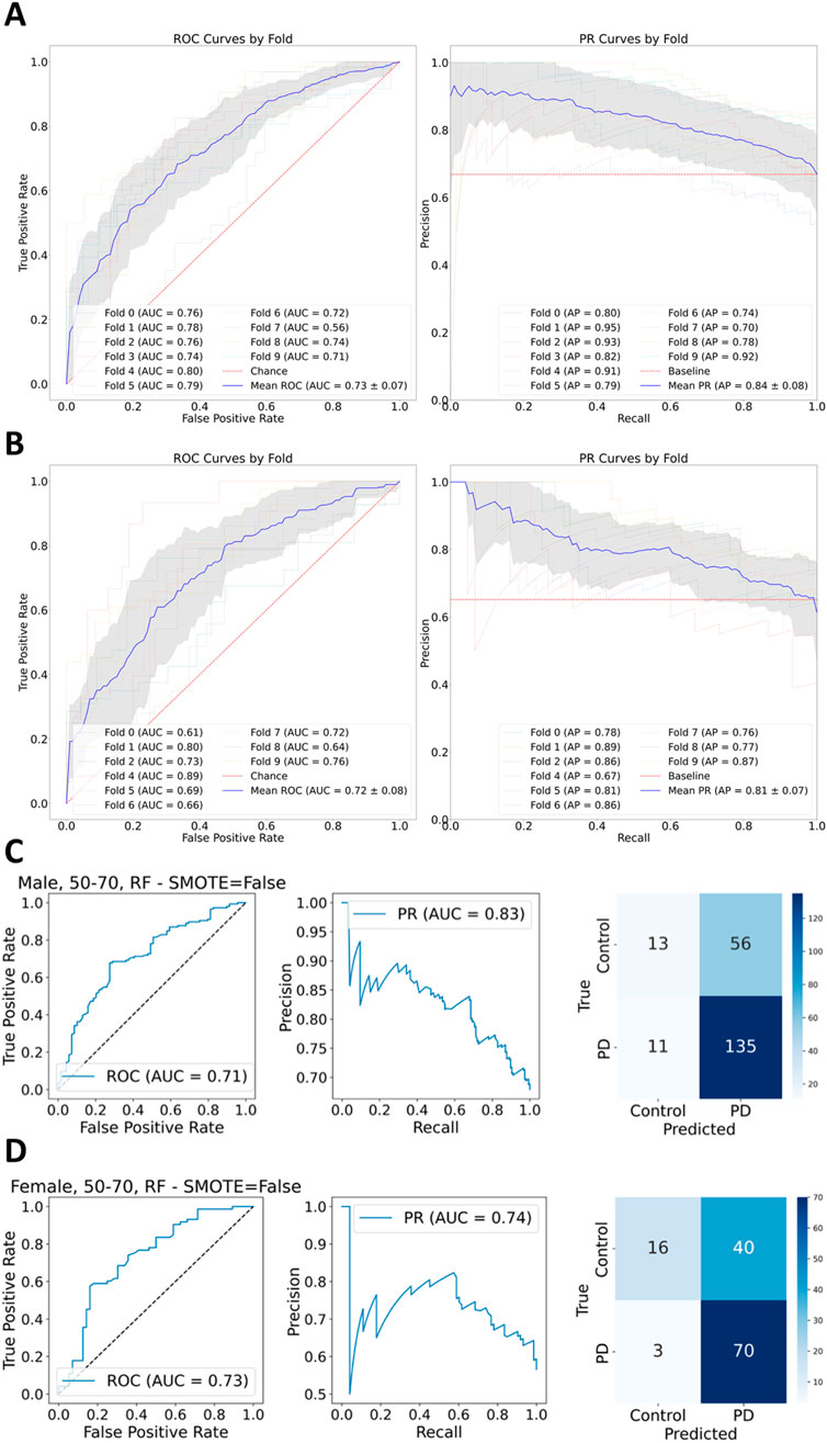 Figure 3. (A) XGBoost 10-fold cross validation ROC-AUC and PR-AUC display promising results across all folds for male stratum. (B) XGBoost 10-fold cross validation for female stratum presents likewise satisfactory results as ROC-AUC and PR-AUC suggest. (C) Predictions made by the Random Forest classifier for the male stratum present a ROC-AUC score of 0.71 and PR-AUC of 0.83, reflecting a moreover satisfactory result in favor of the case class. (D) Random Forest classification for the female stratum yields less satisfactory results compared to the performance on the male stratum in regards to the Precision-Recall, and a slightly better ROC-AUC score.