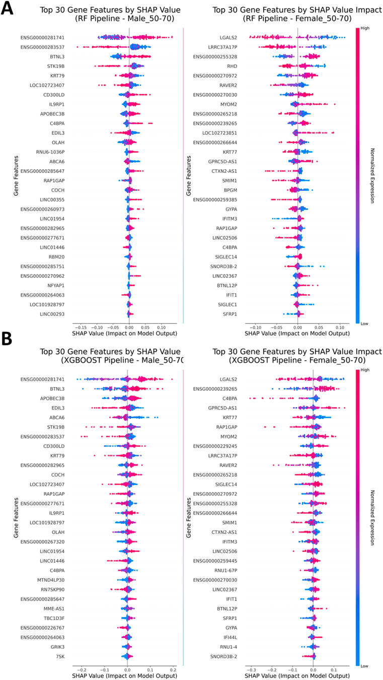 Figure 4. SHAP Analysis. (A) SHAP Analysis results after assessment of the Random Forest classifier (Left: Males, Right: Females). Substantial differences in gene importance during classification can be observed. (B) SHAP Analysis for the XGBoost classification model shares similarities in gene importances as well as expression motifs with the Random Forest classifier in the set of the most impactful genes in the top-half positions of the plots among the respective strata.