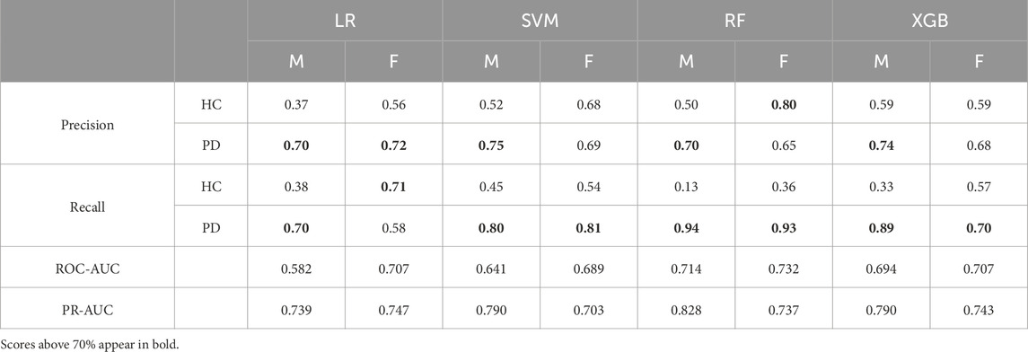 Table 1 summarizes precision and recall for each prediction class (HC = Healthy Control; PD = Parkinson’s Disease) as well as the ROC-AUC and PR-AUC scores for each classification model and gender stratum for ages 50–70 years. The scores captured for the Random Forest and SVM classifiers are high for both, males and females. XGBoost displays a high recall score for males and a lower one for females. Logistic Regression also provides a satisfactory recall with a recall score of 70%. In general, the metrics suggest a relatively modest performance regarding classification of true positives. Logistic Regression presents with a precision of over 70% for all genders. XGBoost and Random Forest deliver precision values of 74% and 70% correspondingly. Interestingly, the Random Forest model achieves its highest precision of 80% specifically for samples originating from female participants. The ROC-AUC and PR-AUC curves alongside with an appropriate confusion matrix were plotted and included in Supplementary Figures S11–S18. Despite the promising performance reflected during the validation phase of the XGBoost classifier, the categorization via Random Forest delivered a slightly better performance during prediction (Figures 3C,D).