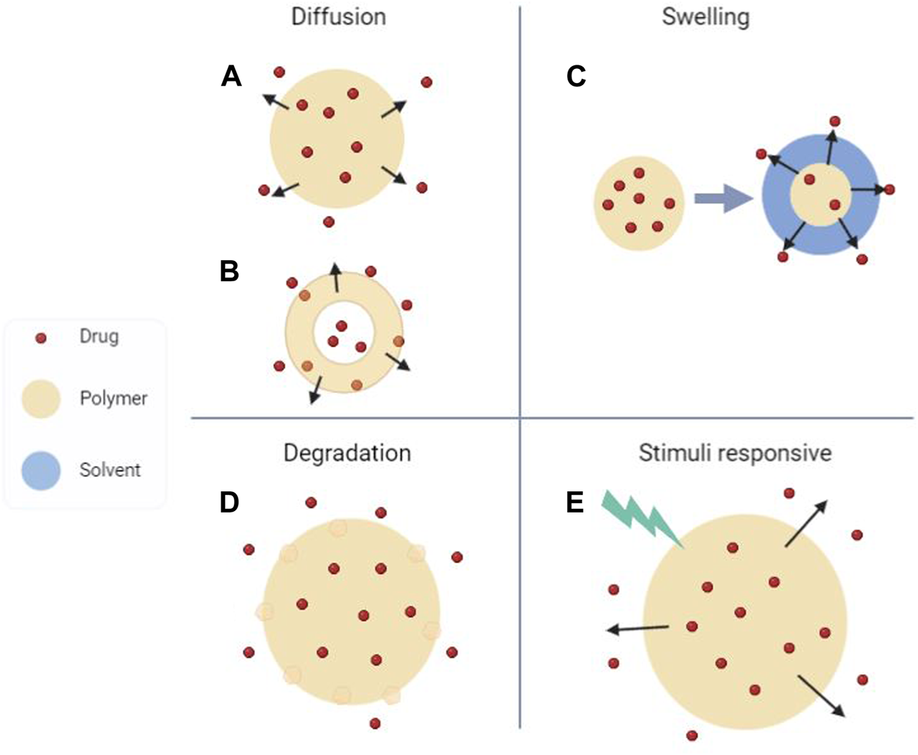 Categorization of controlled release systems (CRSs) according to release mechanism. (A and B) Diffusion controlled systems can be (A) matrix or (B) reservoir based. (C) Polymer matrices can swell to release drugs. (D) Chemical degradation leads to release via surface erosion. (E) Stimuli-triggered “smart” release systems rely on external or environmental cues such as temperature, pH, and enzymatic activity to alter matrix properties. Created using BioRender.