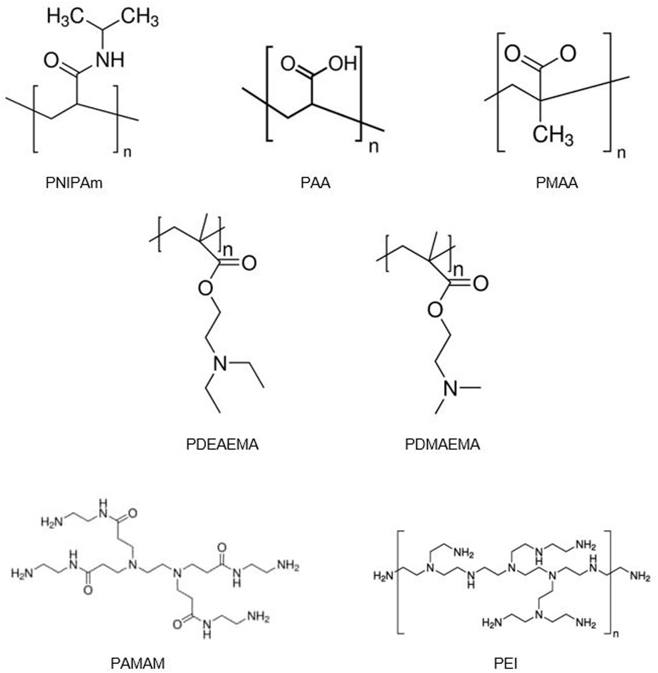 Chemical structures of synthetic polymers commonly used as smart release systems, including poly (N-isopropylacrylamide) (PNIPAm), poly (acrylic acid) (PAA), poly (methacrylic acid) (PMAA), poly (diethylaminoethyl methacrylate) (PDEAEMA), poly (dimethylaminoethyl methacrylate) (PDMAEMA), poly (amidoamine) (PAMAM), and poly (ethyleneimine) (PEI).