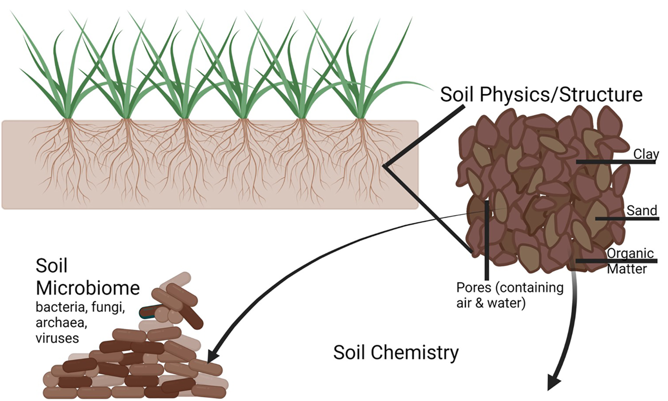 A depiction of the complexity of soil including the soil physics/structure consisting of aggregates of clay, sand, and organic matter with water and air containing pores between them; different soil chemistry constituents (e.g., nutrients, carbon, and signaling compounds) released into the pore spaces by plants, microbes, and other organisms; and the soil microbiome consisting of bacterial, fungal, archaeal, oomycete, protozoan, and viral constituents that contribute to decomposition, pathogenic interactions, and beneficial interactions. Partially created using BioRender.com.