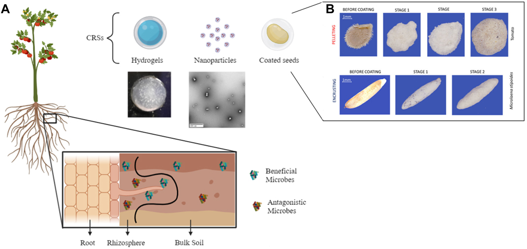 (A) Potential targets of controlled release systems (CRSs) in agriculture include plant roots and the beneficial microbes and pathogens found throughout the rhizosphere adjacent to plant roots and in bulk soil. CRSs may take many forms such as hydrogels (i.e., water swollen polymer networks) and nanoparticles that could be implemented in films, inserts, or as components of (B) seed coatings. Examples shown are of Example of tomato and Microlaena stipoides (Australian grass) coated seeds. (A) Created using Biorender.com. (B) Reprinted without edit under Creative Commons license from Pedrini, S., K. Bhalsing, A.T. Cross, and K.W. Dixon, Protocol Development Tool (PDT) for seed encrusting and pelleting. Seed Science and Technology, 2018. 46 (2): p. 393–405 (Pedrini et al., 2018).