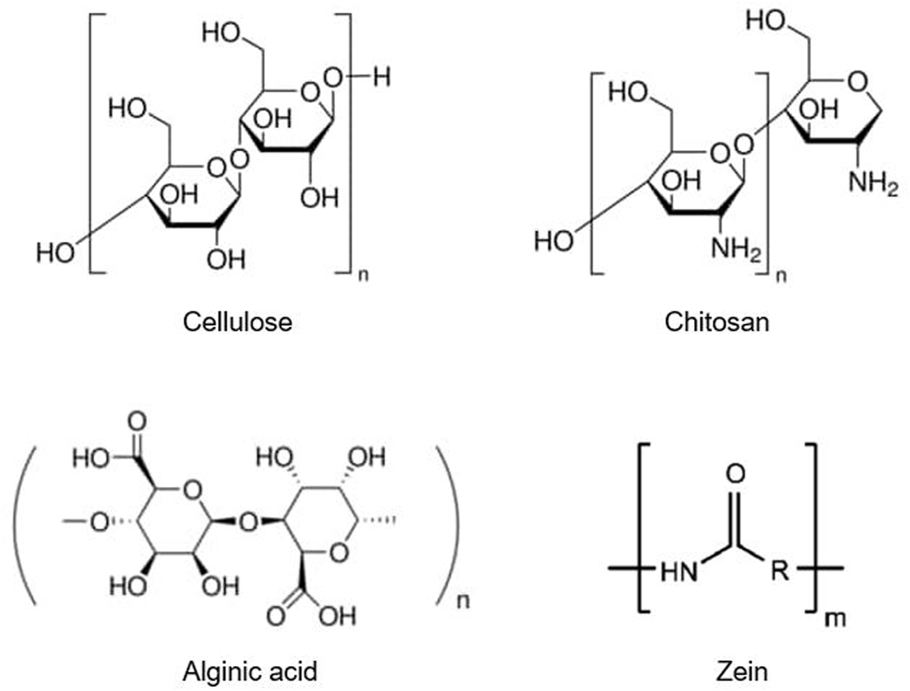 Chemical structures of biopolymers commonly used in agricultural controlled release systems, including cellulose, chitosan, alginate, and zein.