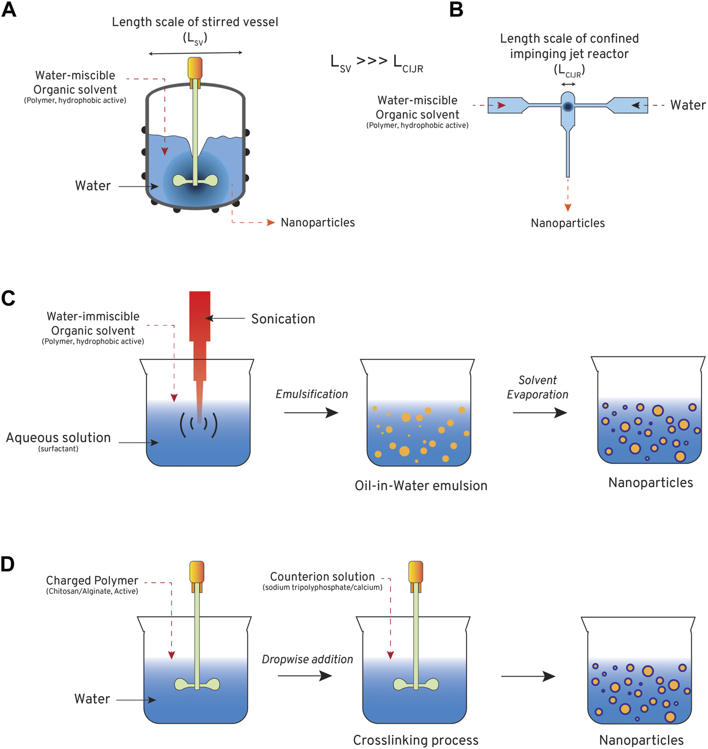 Methods for forming nanoparticle controlled release systems (CRSs): (A) batch nanoprecipitation in large, stirred vessels, (B) flash nanoprecipitation in a confined impinging jet mixer, (C) batch emulsion-evaporation techniques, and (D) batch ionotropic gelation for crosslinking charged matrices.