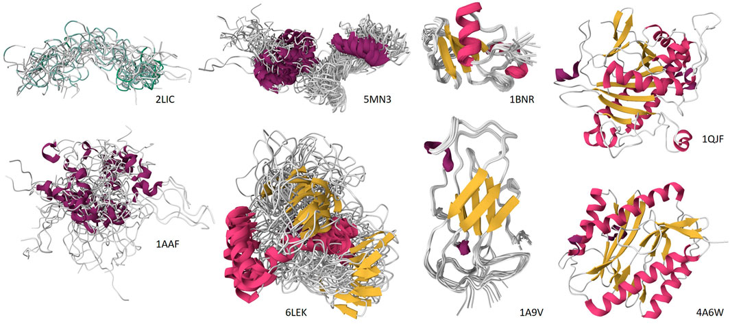 Figure 1. Comparison of the “blurry view” of IDP conformational ensembles from low-resolution methods with the “crisp view” of ordered proteins generated by high-resolution methods, such as X-ay crystallography and NMR. Top row: NMR structure of the polyserine tract of Apis mellifera vitellogenin, residues 358–392 (PDB ID: 2LIC) (Havukainen et al., 2012), NMR structure of the Littorina littorea metallothionein (PDB ID: 5MN3) (Baumann et al., 2017), NMR structure of barnase from Bacillus amyloliquefaciens (PDB ID: 1BNR) (Bycroft et al., 1991), and X-ray crystal structure of isopenicillin N synthase (IPNS) from Emericella nidulans (strain FGSC A4/ATCC 38163/CBS 112.46/NRRL 194/M139) (PDB ID: 1QJF) (Burzlaff et al., 1999). Bottom row: NMR solution structure of the nucleocapsid protein from human immunodeficiency virus type 1 group M subtype B (isolate MN) (PDB ID: 1AAF) (Summers et al., 1992), NMR structure of Megabalanus rosa Cement Protein 20 (PDB ID: 6LEK) (Mohanram et al., 2019), NMR structure of the major house dust mite allergen Der p 2 (PDB ID: 1A9V) (Mueller et al., 1998), and X-ray crystal structure of E. coli methionine aminopeptidase (PDB ID: 4A6W) (Huguet et al., 2012). The corresponding structures are shown exclusively for the illustrative purposes and ar not discussed in the text.