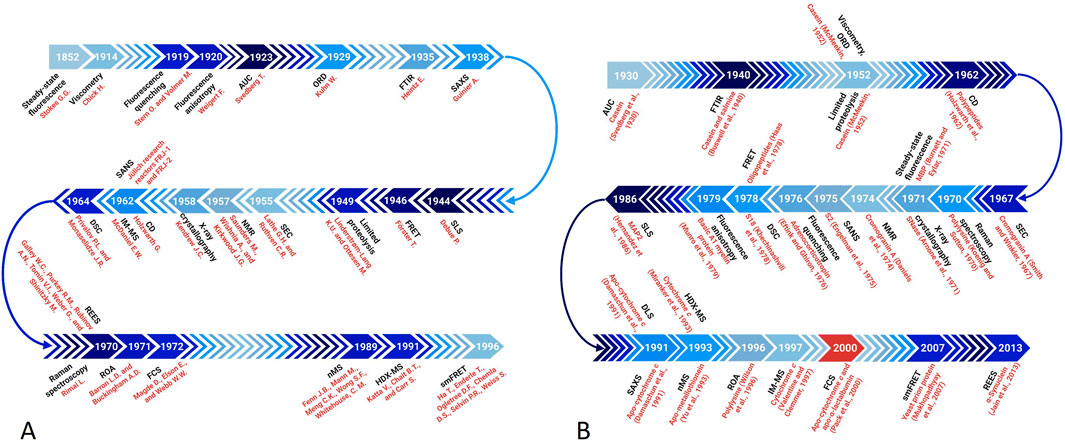Figure 2. A timeline of key discoveries linking specific techniques to the acceptance of the IDP concept. (A) Timing of the introduction of biophysical techniques. (B) Timing of the first use of these techniques in the IDP analysis.