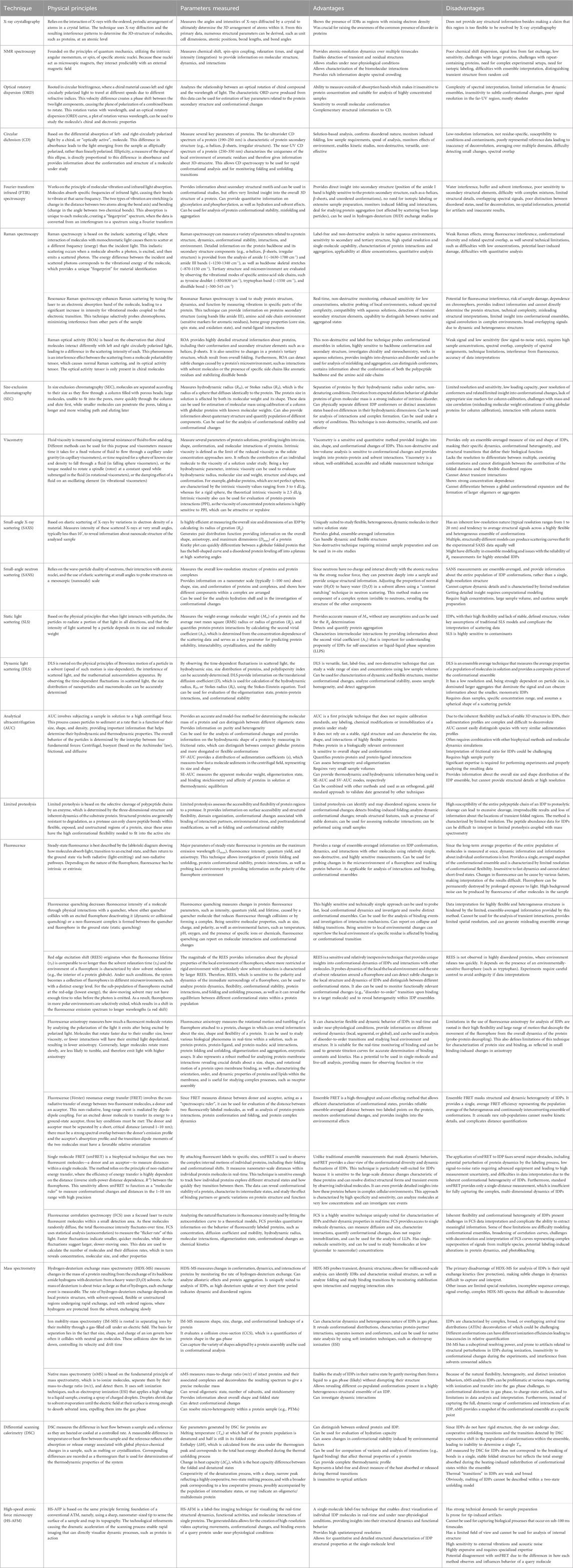 Table 1. Characteristics of low-resolution biophysical techniques contributed to the discovery and initial characterization of IDPs.