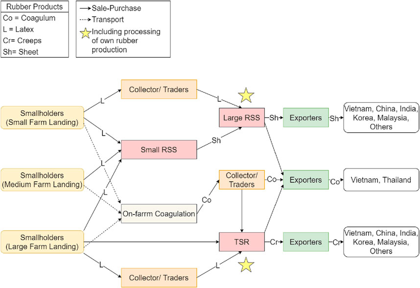 In Cambodia’s rubber value chain, latex is processed into rubber using RSS or TSR methods. Smallholder farmers sell latex or coagulum based on factors like purchase price, processing unit proximity, and transportation availability. Numerous RSS processing facilities exist near smallholder farms, accessible within a day by motorcycle. Large landholders may sell directly to RSS facilities, exporting processed rubber to destinations such as Korea, Vietnam, China, India, and Malaysia (Diepart et al., 2023). TSR processing units also operate, sourcing latex and coagulum, with primary exports to Eastern Europe, Vietnam, China, Korea, Malaysia, and India. Smallholder farmers often coagulate latex on the farm and sell to local collectors, who transport it directly to Vietnam and Thailand, bypassing RSS or TSR processing. Supply chain management (SCM) focuses on the comprehensive synchronization of product information and data movements throughout an organization of businesses, including the primary objective of delivering products or services to the consumer or end user. Subsequently, it represents strategic coordination of operations such as raw material purchasing, manufacturing planning, logistics, inventory management, and forecasting consumer demand. Effective SCM is fundamental to achieving cost savings, increasing market responsiveness, and improving consumer endorsement (Kumar and Sahoo, 2025).