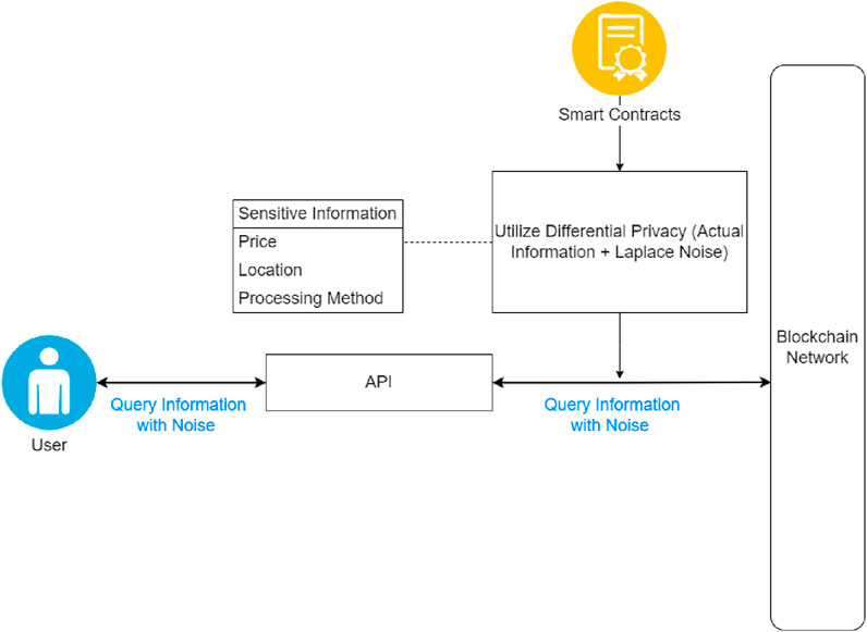 Figure 8 illustrates a privacy-focused system that employs differential privacy mechanisms within a blockchain network to handle sensitive user queries. The procedure begins when the User queries an API that includes intentionally generated noise, protecting the individual’s privacy. The API then sends this noisy query to blockchain-based Smart Contracts, which apply Laplace noise to raw information while keeping up with differential privacy standards. This guarantees that the User’s sensitive information, such as pricing, location, and processing methods, remains secret. The BC network evaluates and solves the query while hidden by noise. Nevertheless, it contains valuable information while adhering to strict privacy criteria. This approach provides an improved process for protecting personal information in our proposed system of differential privacy theoretical protections for private information. The equation for differential privacy using the Laplace mechanism, as introduced by (Dwork et al., 2019), is expressed as: