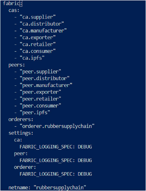 Figure 11 presents the organization configuration in our HLF network; the architecture contains several Certificate Authorities (CAs) for each organization in the SC, from suppliers to consumers, illustrating a decentralized approach to authenticating and authorizing participants. Peers corresponding to each position validate transactions through nodes representing each supply chain stage. A single ‘orderer’ indicates a streamlined consensus process required for transaction ordering. All components have their logging level set to DEBUG, allowing complete monitoring and troubleshooting. The name “rubbersupplychain” refers to the network’s particular use of tracking the lifetime of rubber products to improve supply chain traceability and efficiency.
