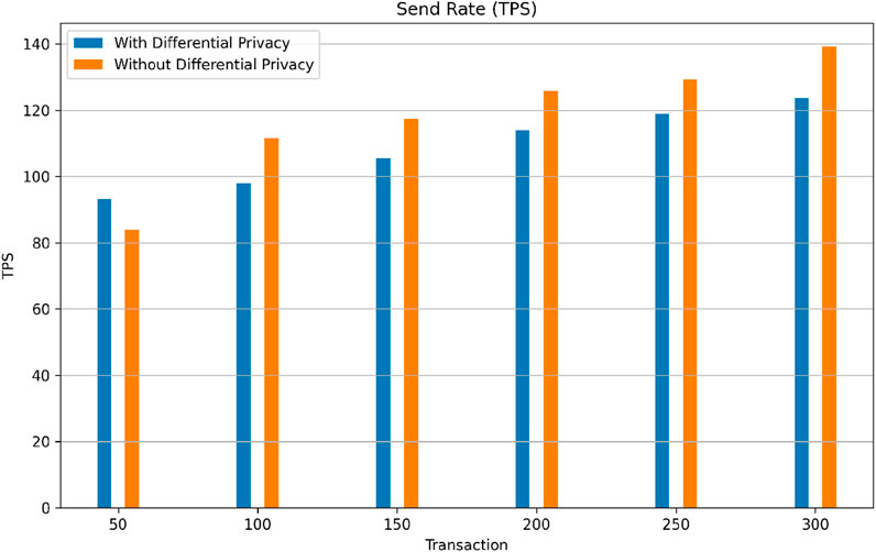 In Figure 12 evaluating the impact of differential privacy on transaction send rates, the analysis presents a comparative performance between systems configuration with and without differential privacy measures. The result encapsulates transaction send rates across increasing transaction volumes, ranging from 50 to 300 transactions. The plot reveals a consistent increase in TPS for both conditions. However, the system without differential privacy starts at a lower rate of 84.0 TPS but surpasses the with-privacy system around the 200 transaction mark, eventually reaching a peak of 139.3 TPS at 300 transactions. This suggests that without using differential privacy may initially impose overhead, it potentially offers higher scalability and efficiency as transaction volumes increase.
