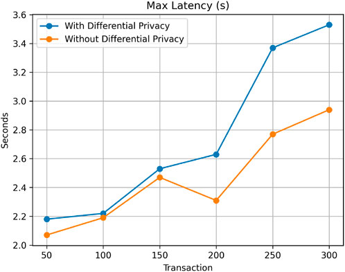 Finally, Figure 16, which contrasts the maximum delay in seconds, allows comprehending how different system configurations with and without differential privacy affect performance. The differential privacy system indicates a strong start with a lower maximum latency of 2.07 s, peaking at 2.94 s and maintaining a continuous increase compared to the non-private system, which starts at 2.18 s and rises more sharply to 3.53 s. This indicates that differential privacy implementations might be more resilient in managing latency spikes under increasing transaction loads, potentially offering better performance stability; therefore, while minimum and average latencies provide a transparent view of consistent performance, the maximum latency underscores the stability of differential privacy in handling peak transaction demands, infusing confidence in the system’s performance capabilities.
